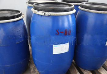 乳化劑S-80,化學名稱為失水山梨醇單油酸脂。為非離子型表面活性劑,無毒、無味;熔點10~20度;HLB值為4.3左右;不溶于水、能溶于熱油類及一般有機溶劑。能與柴油、機油、蠟、瀝青等很好地熔合??勺魅榛瘎⒃龀韯?、分散劑等。